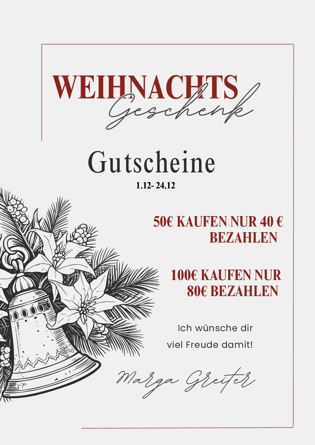 Unsere stilvollen Gutscheine sind die perfekte Wahl und vor Ort erhältlich.